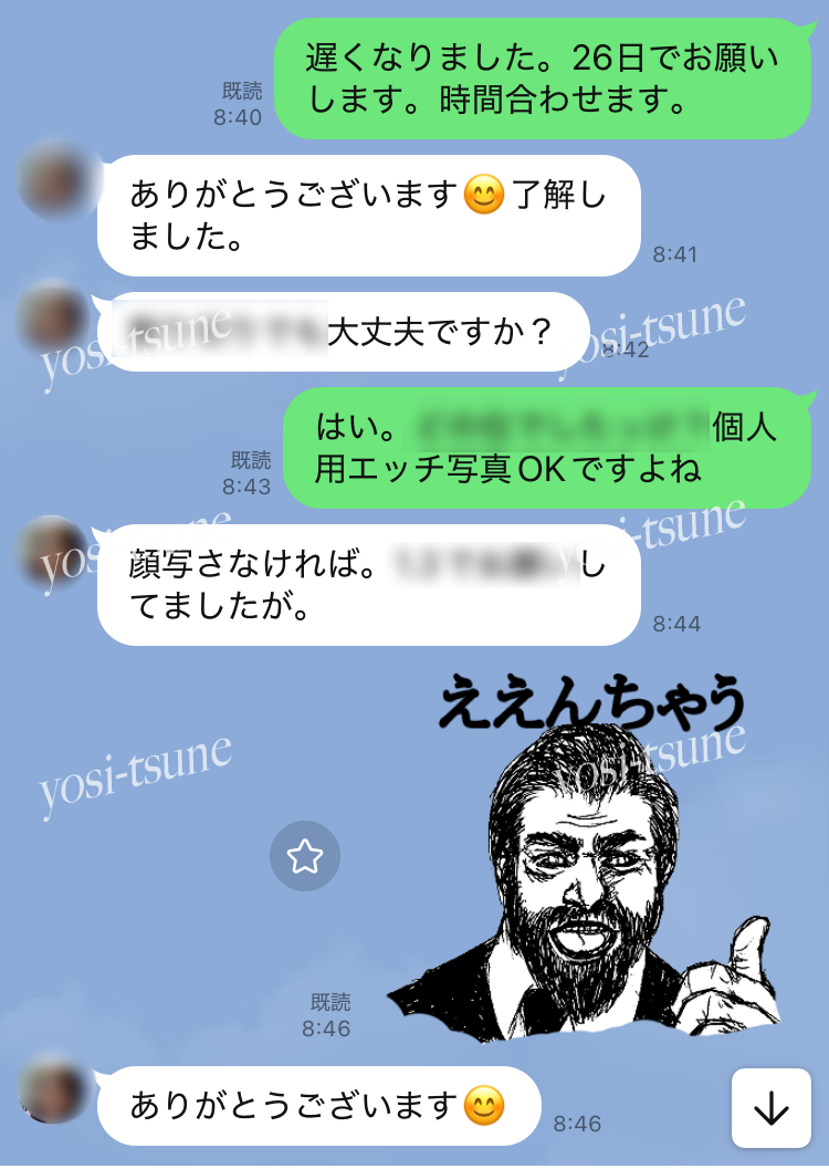 ラインのやりとりでしきりに病気(性病)の事を気にしていたのでお互い検査して大丈夫だったら会いましょうという流れがありました。そしてお互い陰性だという事で安心して会うことになりました。